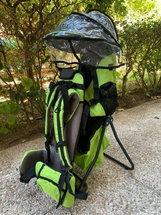 Mochila para el transporte del bebe para montaña o tecking. Tiene soporte para apoyar la mochila en el suelo e incluye toldo para el sol, vieno , lluvia .... que se puede colocar o no. Es plegable. Como nueva. Soporta hasta 15 kg de peso.!