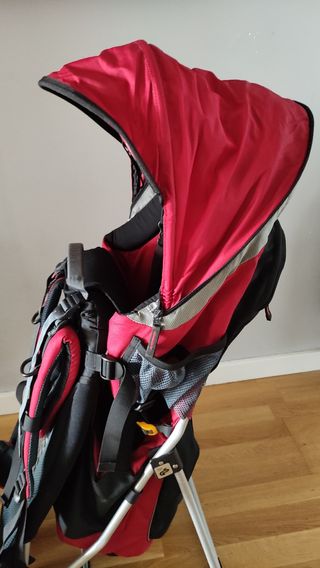 Mochila portabebés diseñada para excursiones y actividades al aire libre. - Color rojo y gris. - Estructura robusta con soporte. - Tirantes acolchados para mayor comodidad.