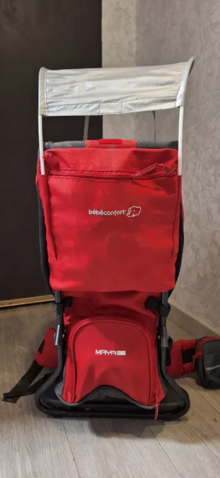 Mochila portabebés en color rojo, ideal para llevar a los más pequeños en tus excursiones. - Diseño ergonómico. - Capota protectora. - Correas ajustables.