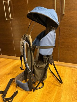 Mochila portabebés Dromader para montaña, con capota y certificado de calidad. - Color azul y gris. - Diseño ergonómico para el bebé y el portador. - Múltiples compartimentos de almacenamiento. - Certificado Prüfengel 'Calidad Verificada'. - Precio nueva en Amazon 166€, ha llevado muy poco uso.