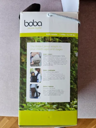 Mochila portabebés Boba Carrier en color gris oscuro. Incluye instrucciones y caja original. - Color: Gris oscuro. - Marca: Boba. - Modelo: Carrier. - Incluye capota. - Acolchado en tirantes y cinturón. - Incluye insertable para recién nacido