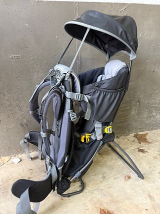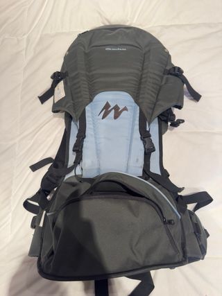 Mochila portabebés de la marca Decathlon, ideal para llevar a los más pequeños en tus aventuras al aire libre. - Diseño ergonómico y acolchado. - Capota solar integrada. - Cinturones ajustables para el porteador y el niño. - Estructura de soporte estable.