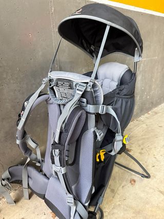 Mochila portabebés Deuter para trekking y montaña, en buen estado. Ideal para llevar a tu pequeñ@ en tus aventuras al aire libre. Puedes verla en la página de Decathlon su precio en tiendas con 170 euros. Se ha usado tres veces está como nueva. - Cómoda y práctica para excursiones. - Estructura resistente y ligera. - Diseño ergonómico para la espalda del portador. - Incluye arnés y sistema de sujeción para el niño. - tiene un techo parasol y funda impermeable adaptada para proteger al niño en caso de lluvia