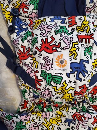 Mochila de porteo Ergobaby con un vibrante diseño de Keith Haring. Perfecta para llevar a tu bebé con estilo y comodidad. Tiene la caja original y las instrucciones. - Diseño exclusivo de figuras de colores. - Etiqueta de la marca Ergobaby visible. - Soporta un peso de 3,2 a 20 kg para llevar cómodamente al bebé.