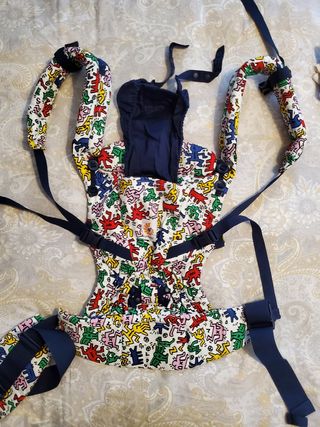 Mochila portabebés Ergobaby edición limitada Keith Haring. 3 posiciones. De 3.2 a 20 kg. Como nueva. Tiene las asas acolchadas. La zona de sujeción en la cadera es muy cómoda. Con sistemas de seguridad en los cierres. También lleva una tela para cubrir la cabecita del bebé y protegerlo del sol. El estampado es muy alegre.