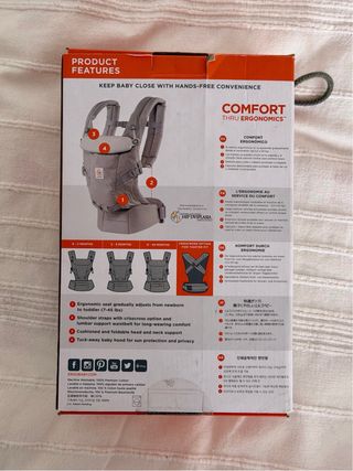 -NUEVA. FueRegalo y ya teníamos otra. Costó 159€. -Mochila portabebés Ergobaby Adapt, ideal para recién nacidos hasta niños pequeños. MÚLTIPLES POSICIONES de porteo. -MOCHILA PORTABEBÉ ERGONÓMICA –3posiciones(abdomen, cadera o espalda).Anchura de la barra, de ajuste continuo, favorece la posición de rana natural y ergonómica desde el nacimiento hasta el niño pequeño (3,2-20,4 kg). -TRANSPIRABLE -MÁXIMA COMODIDAD DE TRANSPORTE -PROTECCIÓN EN LA VIDA DIARIA – soporte para cabeza y cuello, acolchado y plegable, capucha ajustable para proteger contra el sol y aportar privacidad (para dar el pecho). Detalles reflectantes +en mi perfil