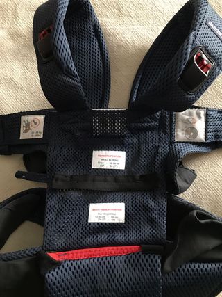 Mochila ergonómica para bebés de la marca Babybjörn, modelo ONE. - Tejido de malla transpirable. - Hebillas de seguridad rojas. - Etiqueta con bandera sueca.