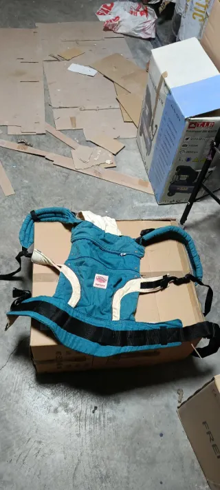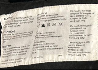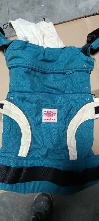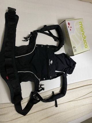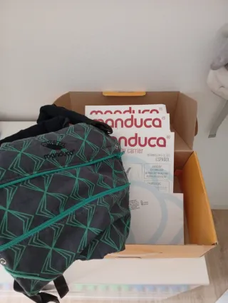 Mochila portabebés Manduca. Muy útil y cómoda, sobretodo por el hecho de poder utilizarla con los tirantes cruzados, se nota menos el peso del bebé. Viene con la caja y las instrucciones. Tiene alguna pequeña mancha, pero se nota muy poco y no afecta al uso.
