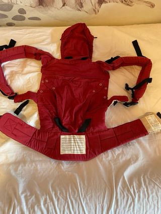 Mochila portabebés en color rojo, marca Manduca. - Diseño ergonómico. - Tirantes acolchados. - Hebillas de seguridad. La mejor mochila para proteger la espalda y cabeza de tu hijo/a recién nacido.