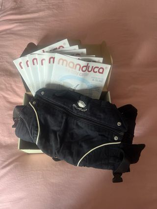 Mochila portabebés Manduca. Muy útil y cómoda, sobretodo por el hecho de poder utilizarla con los tirantes cruzados, se nota menos el peso del bebé. Viene con la caja y las instrucciones. Tiene alguna pequeña mancha, pero se nota muy poco y no afecta al uso.