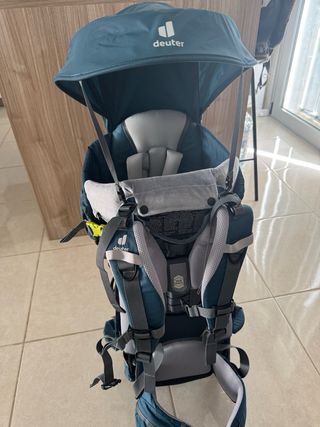 Mochila portabebés Deuter, ideal para montaña y trekking. Diseñada para llevar a los más pequeños cómodamente en tus aventuras al aire libre. - Capota protectora. - Correas acolchadas para mayor comodidad. - Estructura robusta para soporte. NO SE HA ESTRENADO.