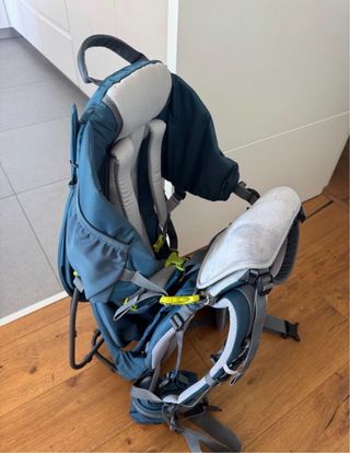 Mochila de trekking profesional, ergonómica y segura. Ideal para senderismo. Estado: Muy bien cuidada y limpia. Comodidad: Sistema de espalda Aircomfort ajustable y ventilado. Seguridad: Arnés de 5 puntos y asiento regulable (Sello TÜV GS). Capacidad: Hasta 22 kg (niño + carga). Extras: Incluye capota solar/viento y gran compartimento inferior. Calidad: Estructura de aluminio ligera con pata de apoyo estable. Una inversión en salud para tu espalda y confort para tu hijo. (PVP nueva: 370€).