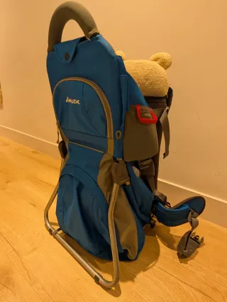 Mochila portabebés de la marca Vaude en color azul. Modelo Jolly Comfort. Diseñada para llevar a los más pequeños cómodamente. - Estructura metálica. - Asa acolchada superior. - Cojín con forma de osito para que el bebé se apoye. Desmontable y lavable. - Bolsillo frontal con cremallera. - Parasol desmontable - Cubre lluvia para evitar que el bebé se moje si llueve - Incluye también un cambiador-esterilla acolchado y un pequeño cojín para sentarse. En perfecto estado