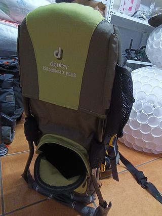 Mochila Deuter Kid confort 1 plus con muy poco uso. Los niños van muy cómodos y seguros y permite hacer rutas largas pues se adapta y reparte el peso muy bien. tiene techito para proteger de la lluvia y el sol.