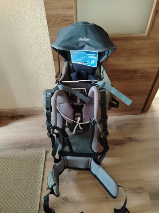 Mochila portabebés de la marca Deuter, ideal para llevar a los más pequeños cómodamente. - Diseño ergonómico. - Capucha integrada para protección solar. - Tirantes acolchados para mayor confort.