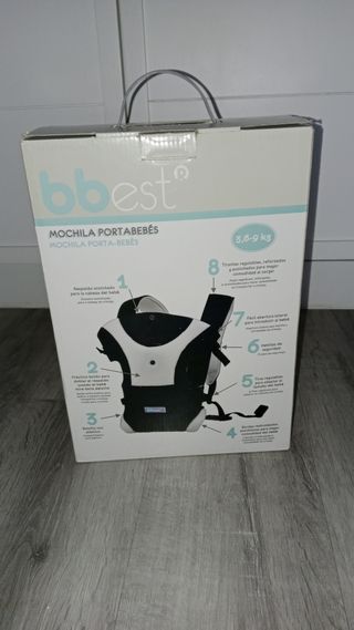 Mochila portabebés de la marca Bbest, diseñada para bebés de 3,6 a 9 kg. Es cómoda y fácil de ajustar. - Respaldo acolchado para la cabeza del bebé. - Práctico bolsillo para guardar el chupete. - Hebillas de seguridad. - Tirantes regulables y reforzados.