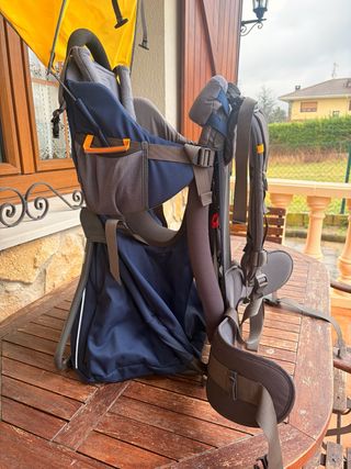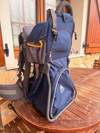 Mochila para llevar bebés en excursiones y paseos por la montaña. Está bastante usada pero la verdad que es muy cómoda y se puede seguir usando sin problema. El toldito se rajó y lo cosimos, lo hemos usado así siempre sin problema. Diseñada para la comodidad del adulto y la seguridad del niño. - Color rojo y negro. - Estructura metálica. - Tirantes acolchados.
