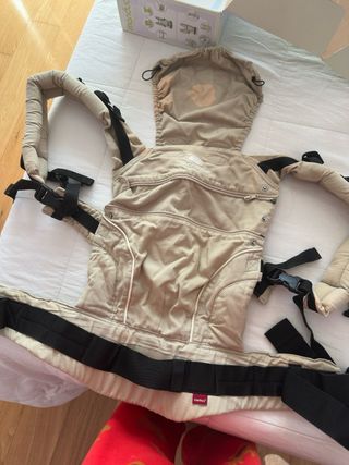 Mochila portabebés de la marca Ergobaby en color negro y beige. Diseñada para llevar al bebé de forma cómoda y segura. - Capucha ajustable. - Cinturón lumbar acolchado. - Tirantes acolchados. - Incluyo un reductor para recién nacidos.