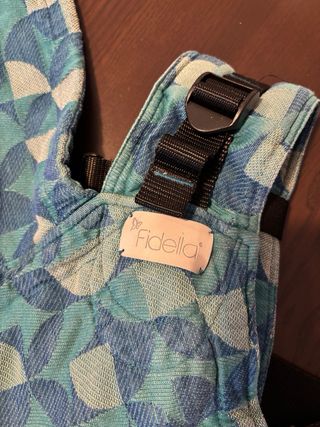Mochila portabebés de la marca Fidella con un diseño estampado en tonos azules y grises. Cuenta con cintas ajustables y cierres de seguridad. - Diseño estampado. - Cintas ajustables. - Cierres de seguridad.