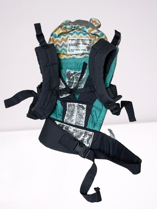 Mochila de porteo, usada con un bebé, tiene 3 posiciones, es muy cómoda. Color verde azulado.