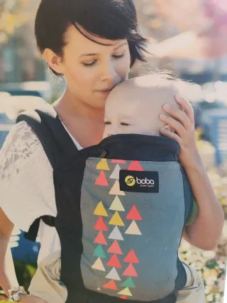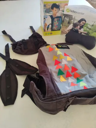 Mochila de porteo marca Boba, en buen estado y con todos sus complementos. - Se puede usar desde recién nacido. - Diseño con triángulos de colores. - Tejido resistente y cómodo. - Incluye todos los accesorios originales.