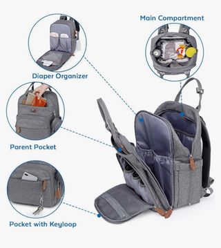 Mochila de biberones,pañales... en color gris, ideal para llevar todo lo necesario para el bebé. - Diseño moderno y funcional. - Múltiples compartimentos para organización. - Material resistente y fácil de limpiar. - Detalles en polipiel. - Bolsillos laterales.