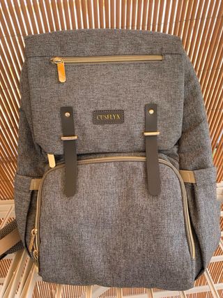 Preciosa mochila para bebé, ideal para llevar todo lo necesario para el cuidado del bebé. - Diseño elegante y moderno en color gris. - Asa superior para llevarla cómodamente en la mano. - Bolsillos múltiples con cremalleras. - Correas ajustables para mayor comodidad.