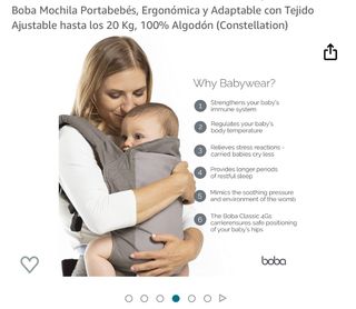 Mochila Portabebes Boba súper cómoda. Lleva capucha incorporada, y un cojin elevador pequeño para cuando son muy peques.