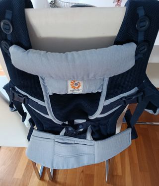 Mochila portabebés Ergobaby en azul marino y celeste. Está en buen estado, lista para usar. - Cómoda y práctica para llevar a tu bebé. - Diseño ergonómico para la espalda del portador. - Tejido transpirable de malla. - Color azul marino y celeste.