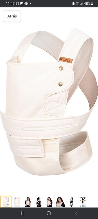 mochila portabebes Marsupi color crema, súper cómoda, con funda para doblar y guardar, no ocupa nada, tirantes con velcro muy fáciles de colocar. De todas las mochilas de porteo que he tenido es la que más he usado. Precio original 75€