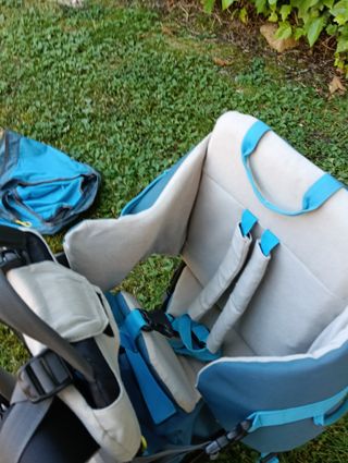 Mochila color azul turquesa. En buenas condiciones. Muy cómoda de poner y quitar. Ideal para bebés que aún no pueden usar mochilas grandes. Respeta la curvatura de la espalda y favorece la postura correcta de las piernas del bebé. La tela es fina y no les da mucho calor. Viene con un adaptador para los bebés más pequeños. Tiene su caja original y las instrucciones. También tiene una banda de protección adicional para poner encima de la mochila y una bolsa para guardarla. La entrega la puedo hacer en Villalba o en Madrid.