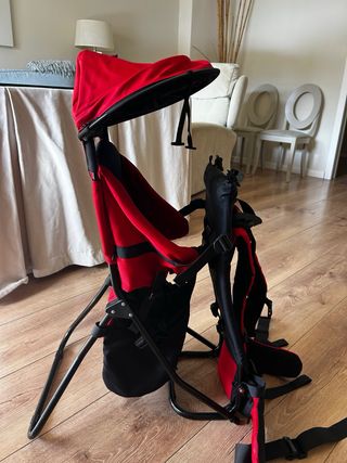 Mochila portabebés de la marca Altus, ideal para senderismo y excursiones. - Color rojo y negro. - Estructura metálica. - Capota integrada.