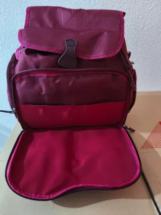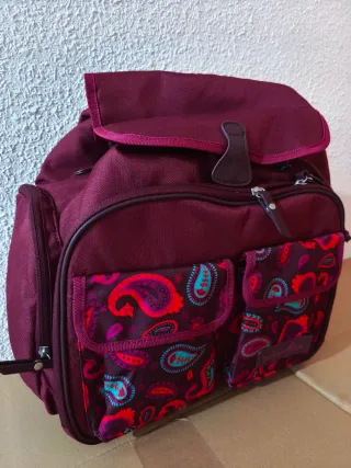 Mochila de color granate con estampado de cachemir en tonos rojos, morados y turquesas. Perfecta para llevar los accesorios del bebé. -4 accesorios: cambiador, portachupetes, bolsillo aislante para biberón, bolsito de almacenamiento -5 bolsillos, tres en parte delantera y dos en laterales -Producto tipo mochila -Correas para cochecito -Medidas: 31cm alto,22 cm ancho, 32 cm largo Esta mochila es perfecta para padres que viajan. Todo es fácilmente accesible para que los padres, mientras viajan con su bebé, encuentren todo lo que necesitan en un instante