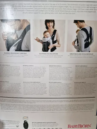 Mochila portabebés BabyBjörn modelo Miracle. - Soporte ergonómico para la espalda. - Apta desde recién nacido hasta aprox. 15 meses. - Peso recomendado: 3.5-12 kg (8-26 lb).