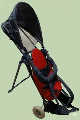 Mochila portabebés de color rojo y azul, diseñada para llevar a los niños en excursiones. - Capota protectora. - Arnés de seguridad. - Estructura acolchada. Tiene para ajustarse adelante, abrocharse: broche para la cintura y tambien otro por encima del pecho. Con funda para recubrimiento de las ruedas. Las fotos estan retocadas unicamente para ponerles un fondo verde claro.