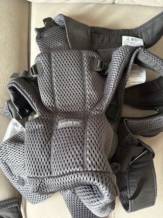 Mochila de porteo BabyBjörn en color gris, ideal para llevar al bebé cómodamente. - Tejido de malla transpirable. - Diseño ergonómico. - Ajustable para el crecimiento del bebé.