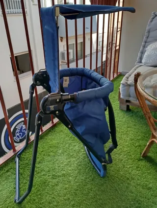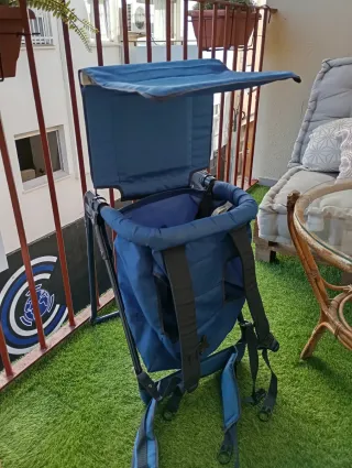 Práctica silla o mochila de paseo en color azul. Es plegable, ligera y fácil de transportar. - Con parasol. Ideal para excursiones al campo, montaña, etc. Mis hijas han disfrutado mucho de ella. - Estructura de metal. - Tejido resistente.
