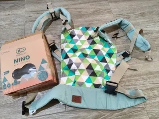Mochila portabebés Kinderkraft modelo NINO, con un diseño geométrico en tonos verdes, grises y beige. Es cómoda y práctica para llevar al bebé. - Diseño con triángulos multicolores. - Tejido 100% algodón.