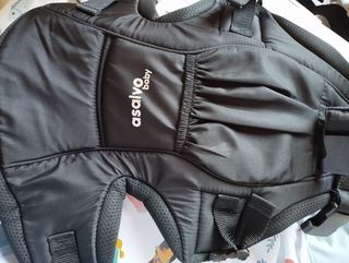 Mochila portabebés de la marca Asalvo, ideal para llevar al bebé cómodamente. - Color negro. - Tejido acolchado y transpirable. - Correas ajustables.