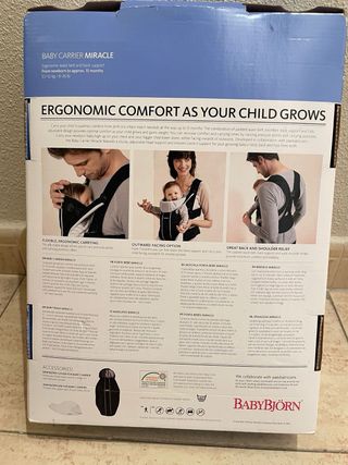 Vendo mochila portabebés BabyBjörn Miracle, color negro y plata. Poco uso, está en buen estado. - Tejido mezcla de algodón. - Para recién nacidos hasta aproximadamente 15 meses (3.5kg a 12kg). - Diseño ergonómico con refuerzo lumbar.