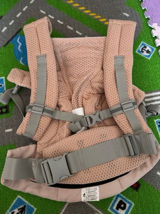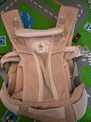 Mochila portabebés Ergobaby en color rosa, ideal para llevar al bebé de forma cómoda y segura. Su diseño ergonómico se adapta tanto al bebé como a quien la lleva. - Tejido de malla transpirable. - Logo de la marca visible. - Cierres ajustables.