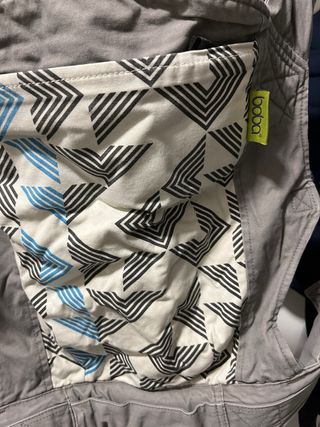 Mochila ergonómica para llevar a tu bebé de la marca Boba. Es de color gris y tiene un estampado geométrico en blanco, negro y azul. - Diseño moderno y funcional. - Etiqueta de la marca Boba visible.