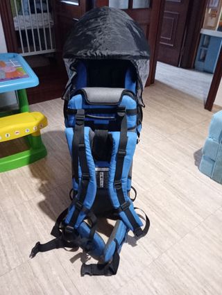 Mochila portabebés azul, desde los 0 meses hasta los 12 kg, que se va regulando según la altura del bebé. En muy buen estado.