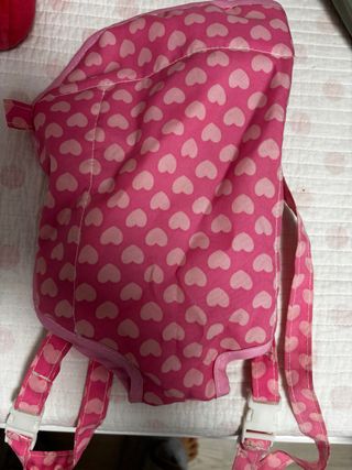 Mochila portabebés con estampado de corazones rosas. - Diseño divertido y colorido. - Tirantes ajustables.