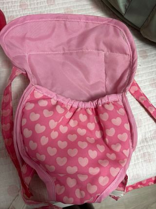 Mochila de porteo para muñecos de Bebés Llorones. Ideal para que los más pequeños lleven a sus muñecos. - Diseño con estampado de gotas de agua. - Colores rosa y turquesa. - Tirantes ajustables.
