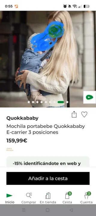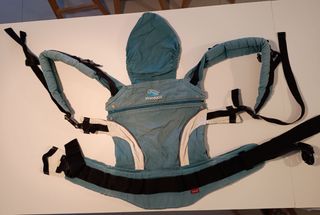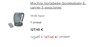 Mochila portabebés Quokkababy E-Carrier en color gris y verde menta. Diseñada para llevar al bebé de forma cómoda y segura. - Tejido ligero y transpirable. - Tirantes acolchados ajustables. - Capucha integrada. La vendo sin uso totalmente nueva, sólo se probó una vez. La vendo al precio que me costó.