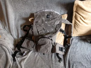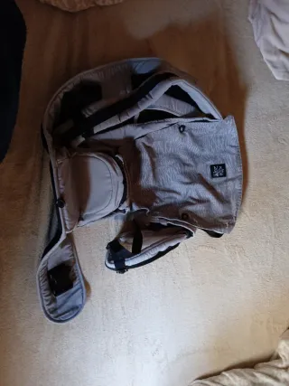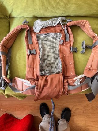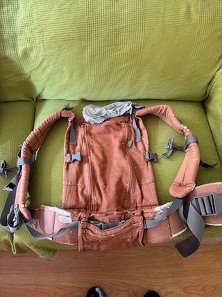 Mochila de porteo de la marca Love & Carry. - Color terracota con estampado de estrellas blancas. - Capucha ajustable. - Tirantes acolchados. Presenta desgaste de la tela evidentes que se pueden observar en la foto, pero no afecta para nada en la efectividad al del porteo. Se vende junto a unas empapaderas que se colocan en los tirantes para que el bebe cuando se lo meta en la boca no manche la mochila. Un unico dueño, la he utilizado muchísimo, me costo nueva 150 euros. El precio es debido al desgaste de la tela