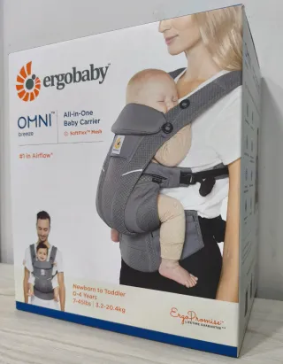 Mochila portabebés Ergobaby Omni Breeze en color gris. Diseñada para máxima comodidad y ventilación. - Modelo: Omni Breeze - Material: SoftFlex™ Mesh - Apta para recién nacidos hasta 4 años (3.2-20.4 kg) - Certificada como #1 en flujo de aire