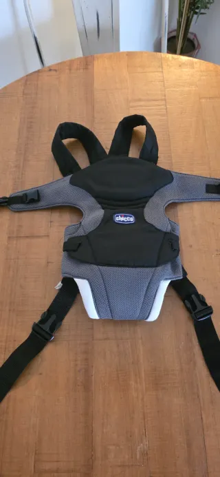 Mochila portabebés de la marca Chicco, diseñada para bebés de entre 3.5 y 9 kg. Es cómoda y fácil de ajustar. - Color gris y negro. - Tejido de malla transpirable.