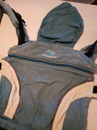 Mochila portabebé de la marca Manduca en color verde. En muy buen estado aunque con la tela lavada. Confeccionada en algodón y lino y con respaldo ampliable.